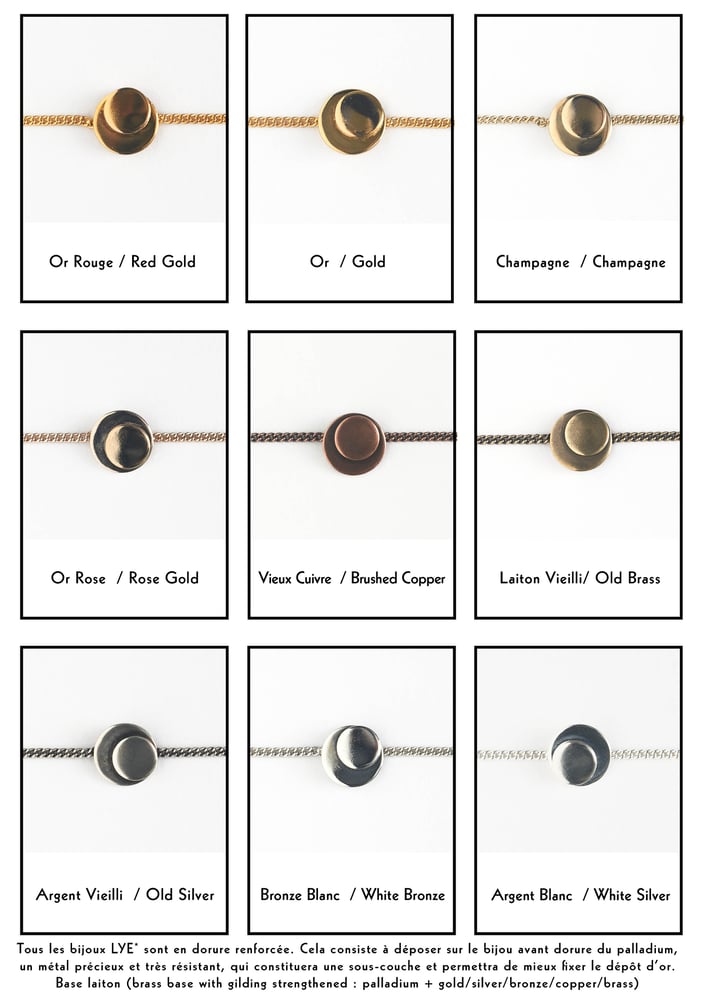 Tous les bijoux sont disponibles en 10 couleurs de métal au choix.