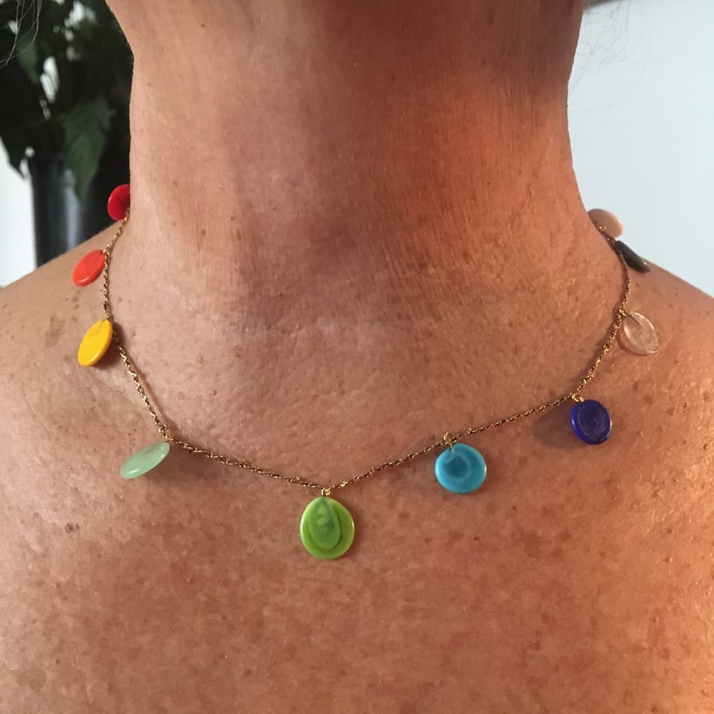 Ras du cou avec plusieurs pastille de Murano en dégradé. Chaine base laiton. Dorure renforcée 1 micron. Longueur 45 cm Couleur possible de la chaine à choisir dans les 10 couleurs LYE*